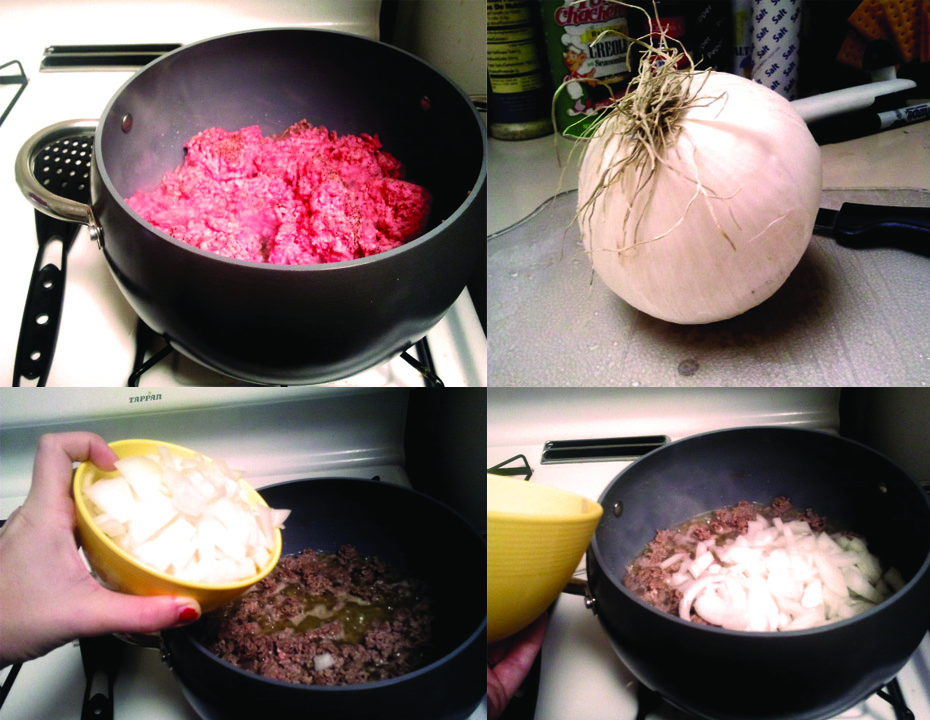 Brown your meat and cook thoroughly in a separate pot. When the meat begins to brown add in your onion, chopped. Let that cook for about 15 minutes on high or until meat is cooked. After that, add your meat and onions to the crockpot (pre-heat to high). Start adding the other ingredients.